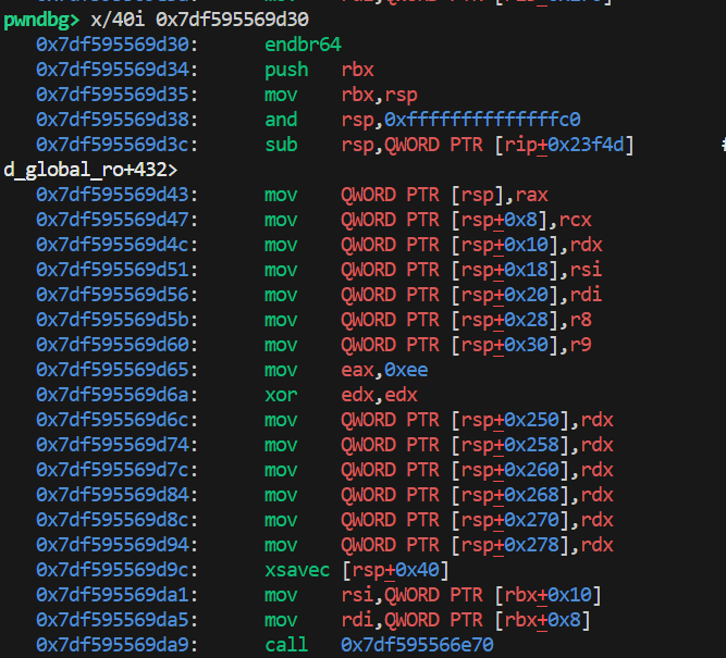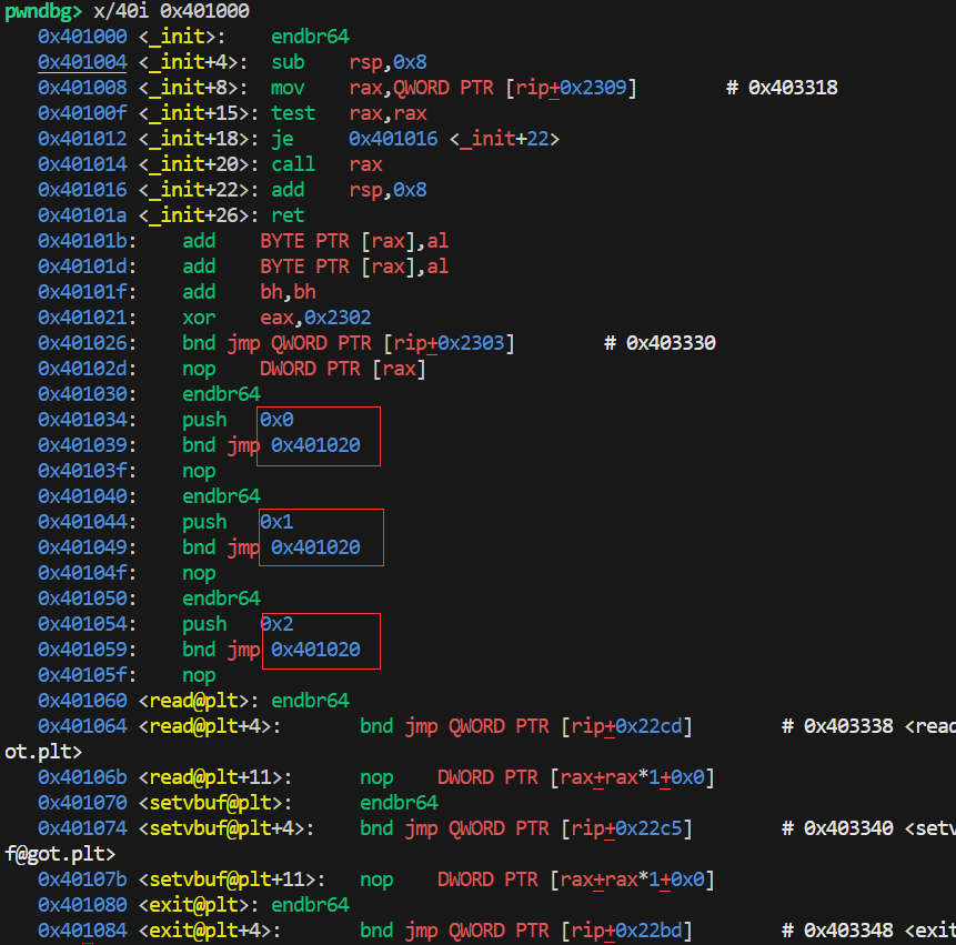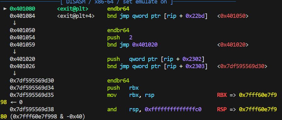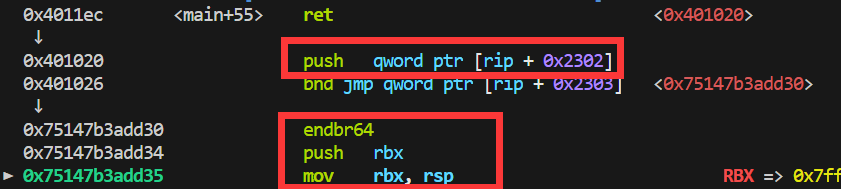 注意到它们 jmp 的相同,但 push 的不同;所有的函数最后都 push [rip + 0x2302],然后 jmp [rip + 0x2303] <0x7df595569d30>;