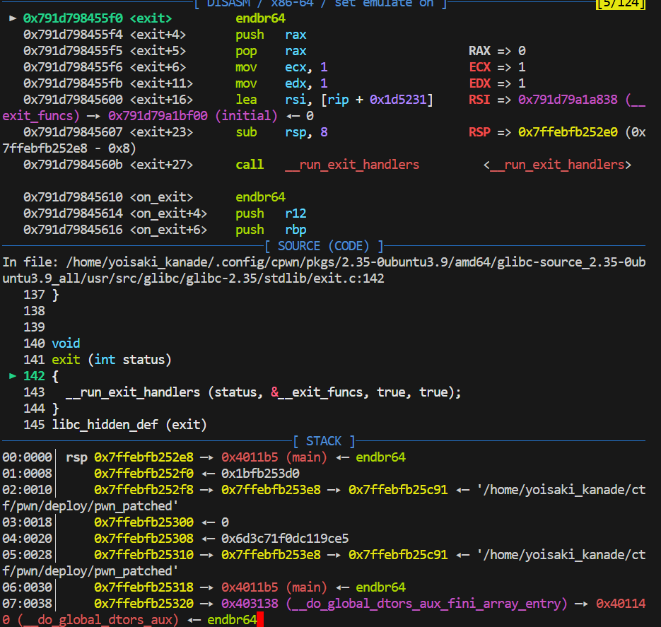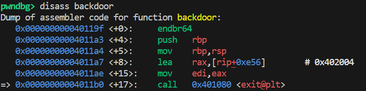 所以可以得知,我们的 payload 在 padding 后面加上 p64(0x401020) + p64(0x2),就会执行 exit。